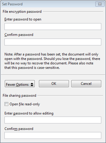 This way, you can make the content of a document available for reading to a selected group of people, and for reading and editing to a different group. This behaviour is now compatible with Microsoft Word and Excel file protection.